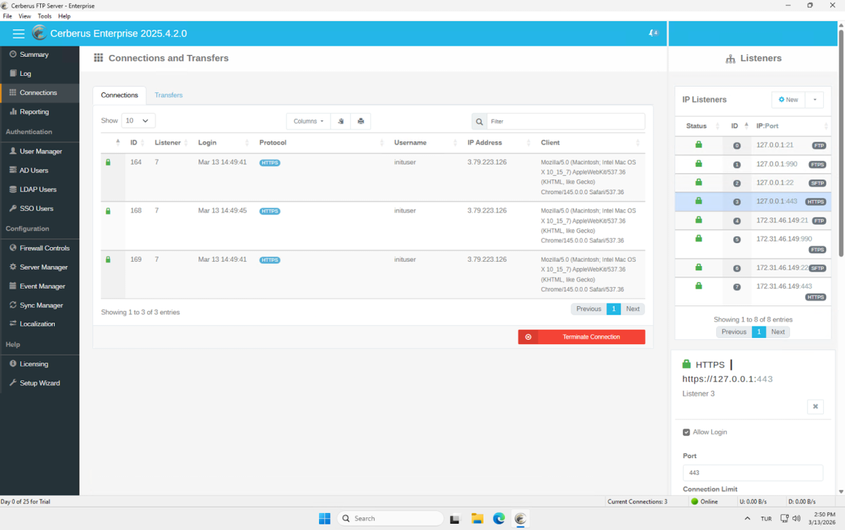 The Connections tab lists the connection ID, listener, login time, protocol, username, IP address, and client user agent for all active sessions. During our sharing test, three concurrent HTTPS connections were visible from the same IP address, all originating from the inituser account. A Terminate Connection button is available at the bottom for forcibly ending any active session.