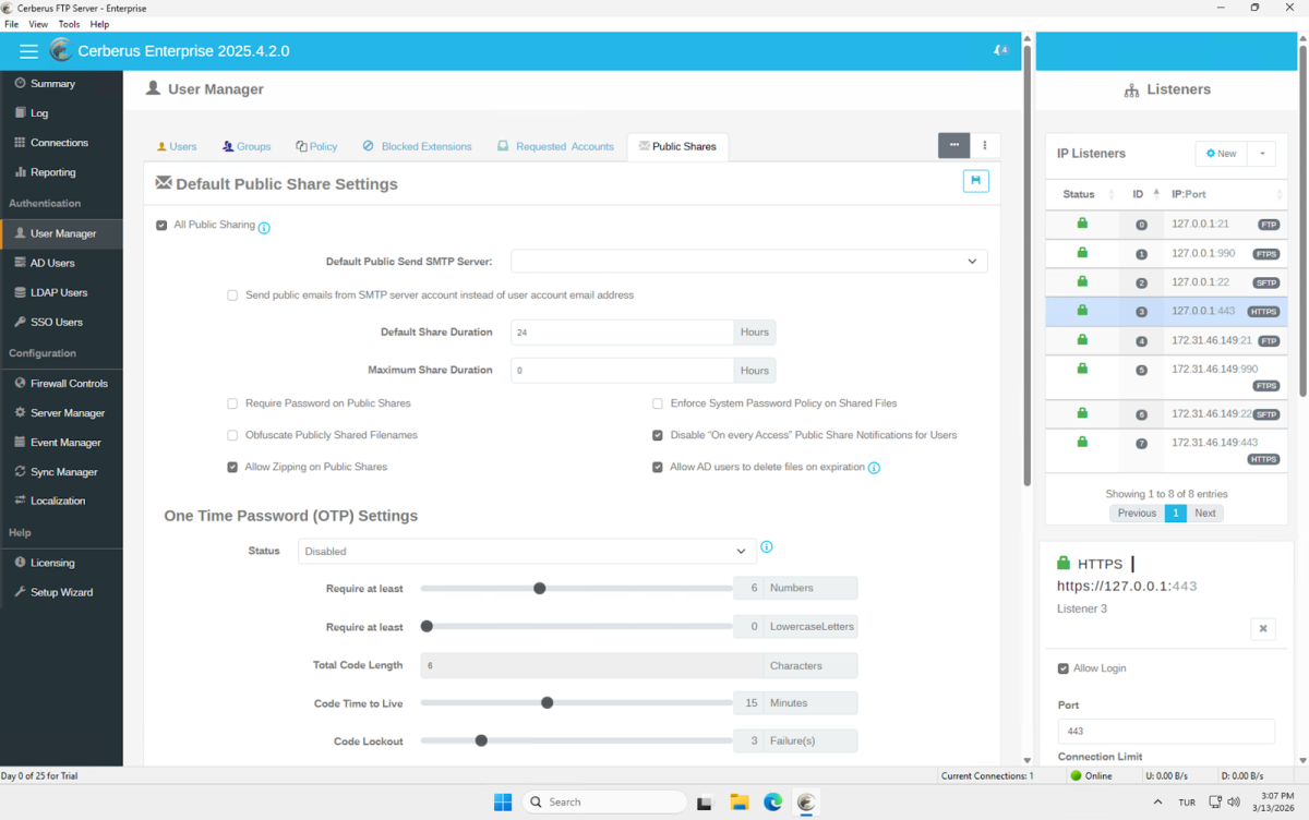 We downloaded and installed Cerberus FTP Server from scratch, set up the admin panel, and explored the web interface available to end users, including file uploads, account settings, and file sharing.