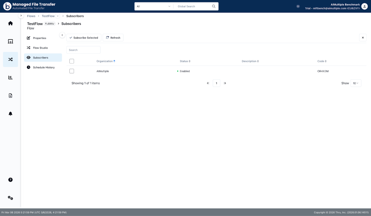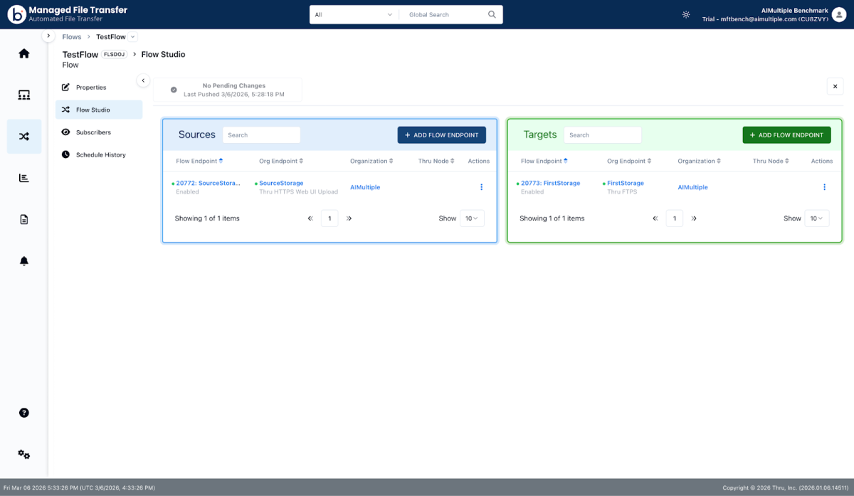 - Thru handles transfers through its Flow Studio files move between configured source and target endpoints rather than through a direct upload interface. Internal file upload via the File Upload modal in Flow Studio works without issue. The web form embed feature (for external submitter-facing pages) failed in practice due to CORS errors. No CORS configuration was found in the trial interface, though one may exist elsewhere in the platform.