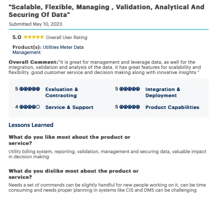 Utilities Meter Data Management by Oracle, a Meter Data Management (MDM) solution, centralizes and manages metering data with a focus on scalability and integration. The tool offers:
