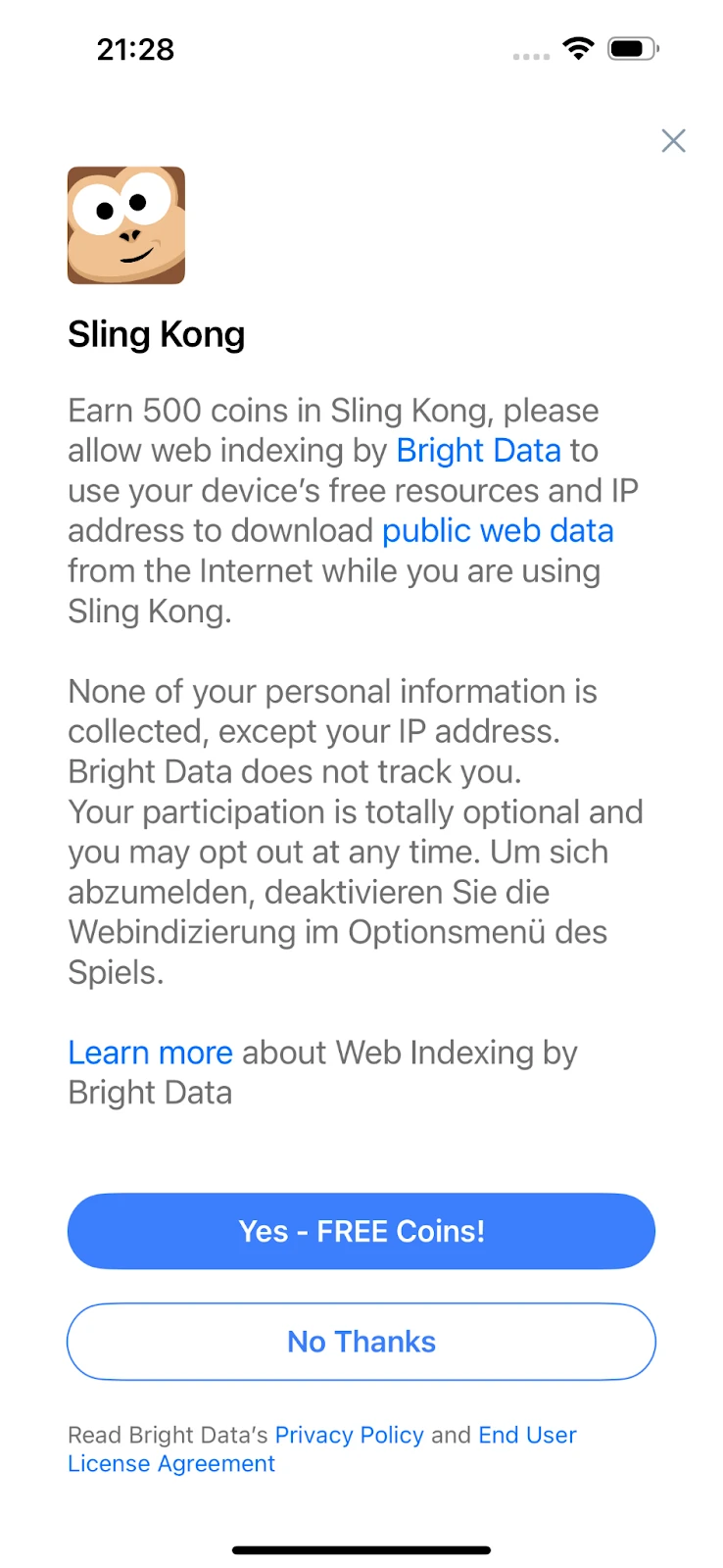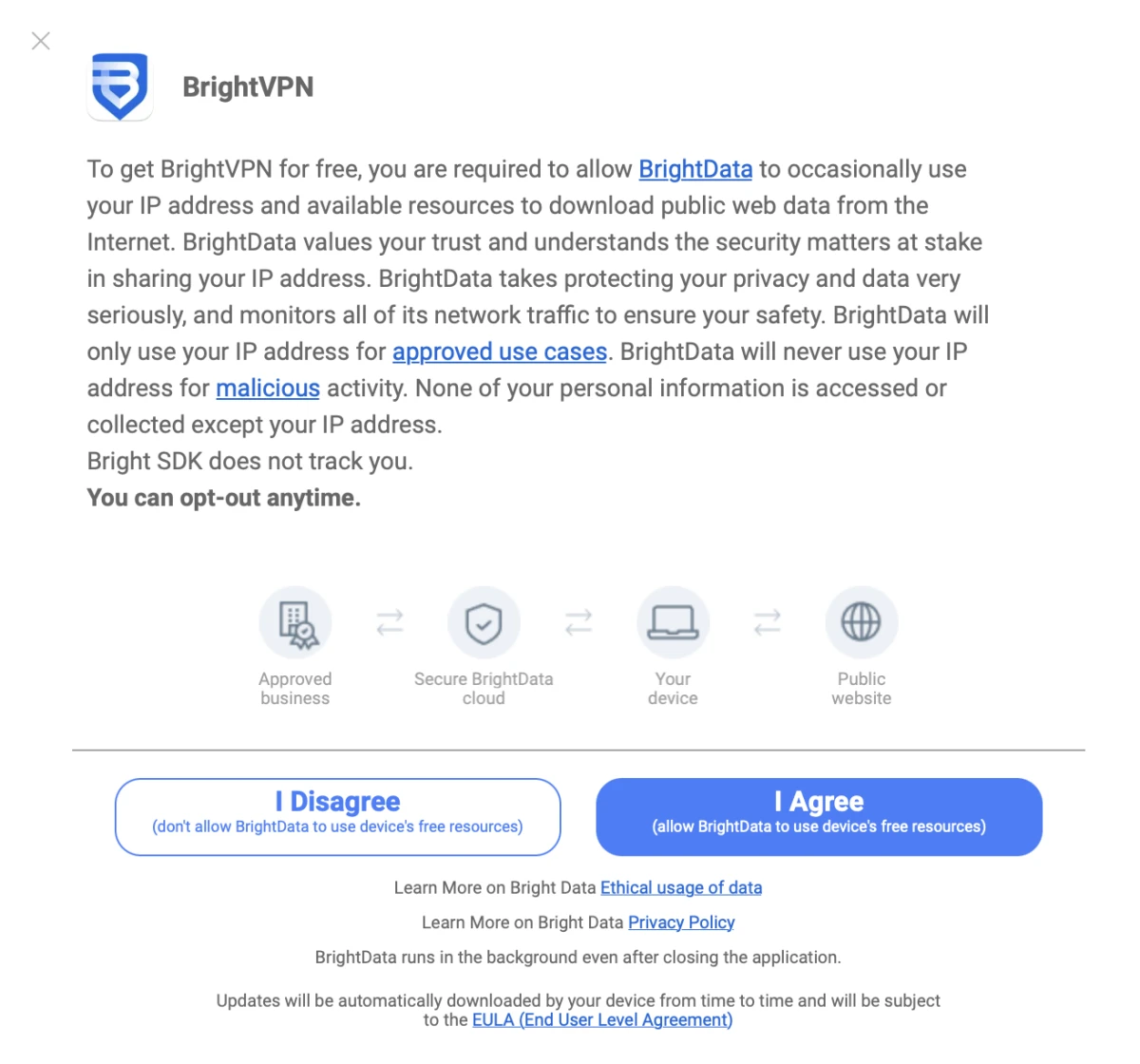 Opt-in form with obligation not to collect personally identifiable data: Consent form with clear explanation from Bright VPN:
