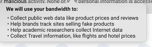 Bandwidth required by web data infrastructure companies can be supplied in an ethical manner by providing benefits (e.g. payments, features like the ability to skip ads) in exchange for consent to share one’s internet connection. However, it is also possible to gain unauthorized access to retail users’ systems and sell their connections.